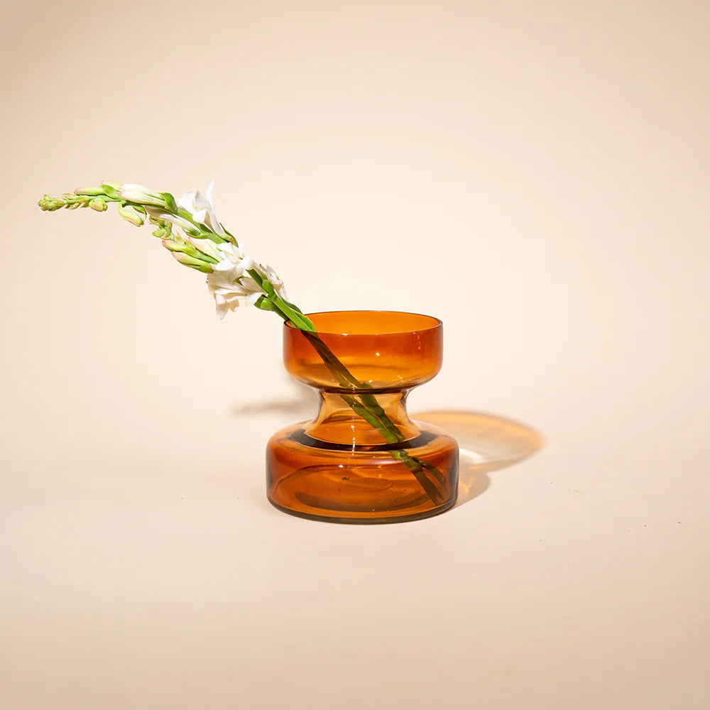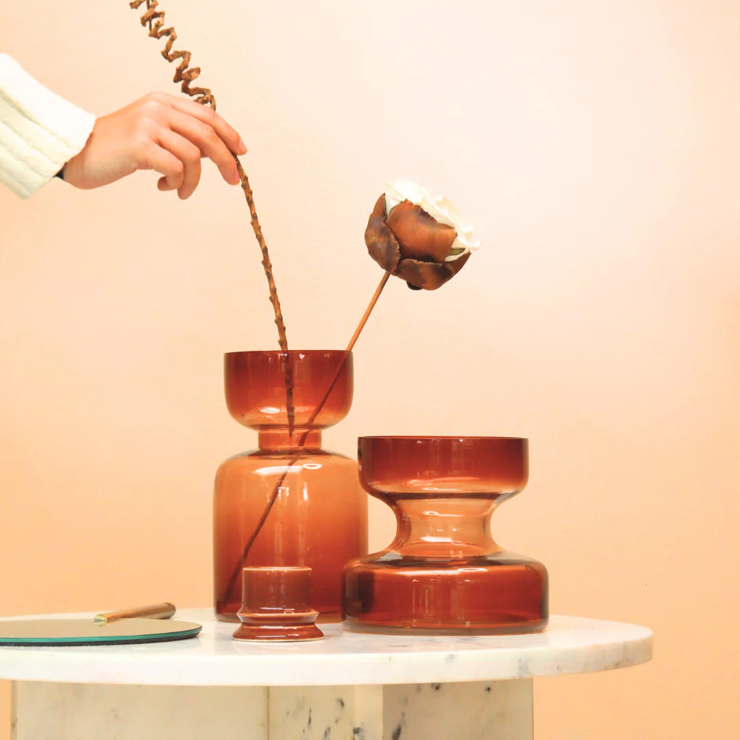 Eine Kollektion im Vintage-Stil, die mit ihren klassischen Farben auf kühne, moderne Geometrie trifft. Diese Glasobjekte, in unterschiedlichen Größen, bestechen durch die markante Sanduhrform, die in einem satten Haselnusston gehalten ist. Der Farbton taucht alles in ein warmes Licht und verwandelt selbst eine einfache Trockenblume in ein stimmungsvolles Kunstwerk.