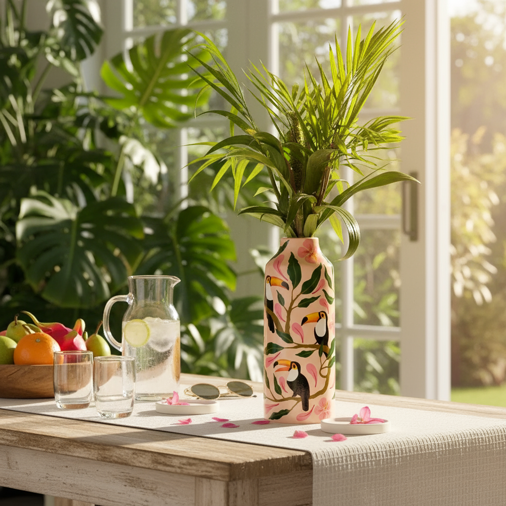 Die handbemalte Terrakotta-Blumenvase „Tropical Tango“ bringt mit ihrem charmanten Toco-Tukan- und Blättermotiv tropisches Flair in Ihre vier Wände. Der liebenswerte Toco-Tukan in Rosatönen und der üppig grüne Blätterhintergrund machen diese Vase zu einem echten Blickfang für Ihre Lieblingsblumen.