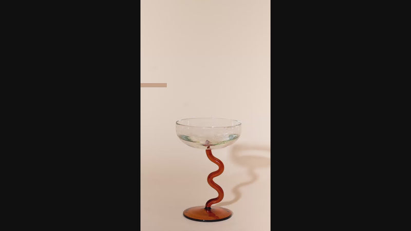 Say goodbye to boring glassware. These champagne coupe glasses feature a classic, broad bowl elevated by a playful, hand-blown spiral stem, culminating in a brightly colored base. Playful swirled stem design creates a dynamic, elegant drinking experience. Comes in lively Pink and warm Amber hues to suit any mood.